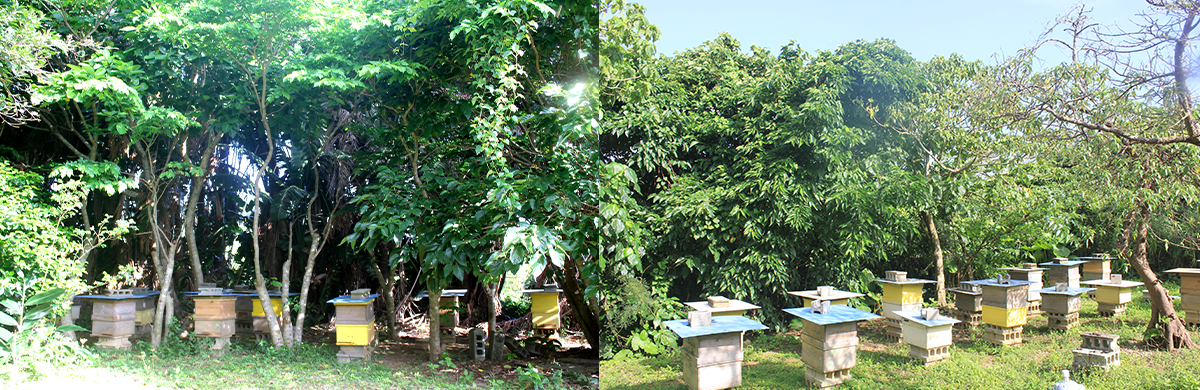 沖縄本島から更に南西へ約400㎞の位置に浮かぶ、12の有人島と多くの無人島からなる八重山諸島。その一つ、二番目に大きな島が石垣島です。(海岸線長162.2km)沖縄県で一番高い山、於茂登岳(526m)があり、コバルトブルーの美しい海に囲まれ、冬でも平均気温が18度と暖かく、鮮やかな花々が咲き、恵まれた自然の中でミツバチ達はのびのびと一年中活動を続けている環境です。